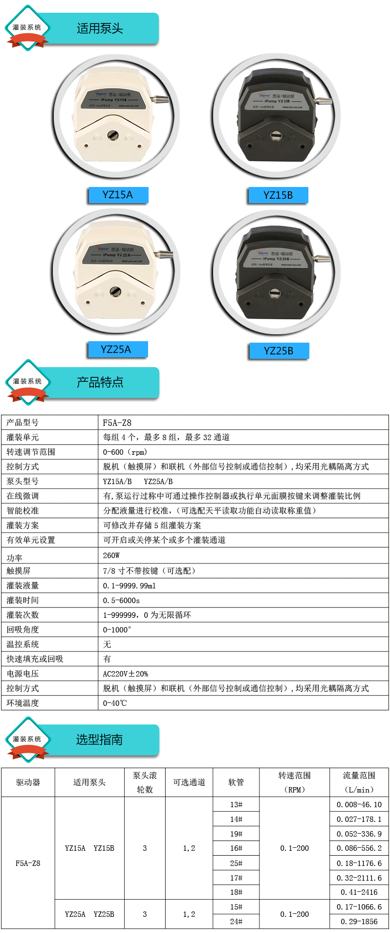 1.灌裝系統(tǒng)由5組基本通道(可擴展至32通道),一臺控制器組成,可安裝YZ15、YZ25泵頭