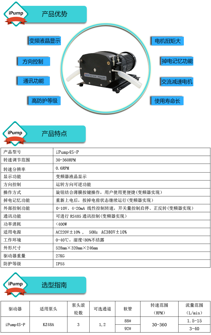 ? ? ?1.流量范圍:1.5-40L/min ? ? ?2.彈性壓管結構,軟管壽命長,非常適合大流量液體傳輸 ? ? ?3.免維護交流減速電機驅動,變頻器調節轉速 ? ? ?4.全金屬泵頭,高精度,更可靠 ? ? ?5.高防護等級,更適合惡劣環境中使用